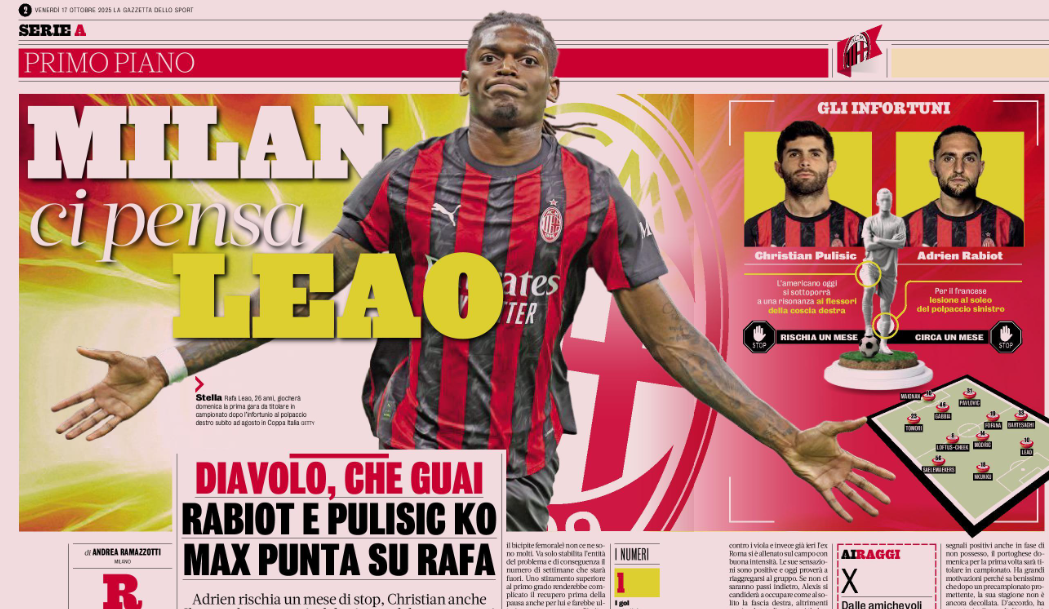 Rabiot and Pulisic will miss the match against Fiorentina, but Rafa Leao is ready to start his first Serie A game of the season. Milan, hit by injuries to the Frenchman and the American after the international break, and with Saelemaekers and Estupiñán not in top condition, will rely on their number 10.