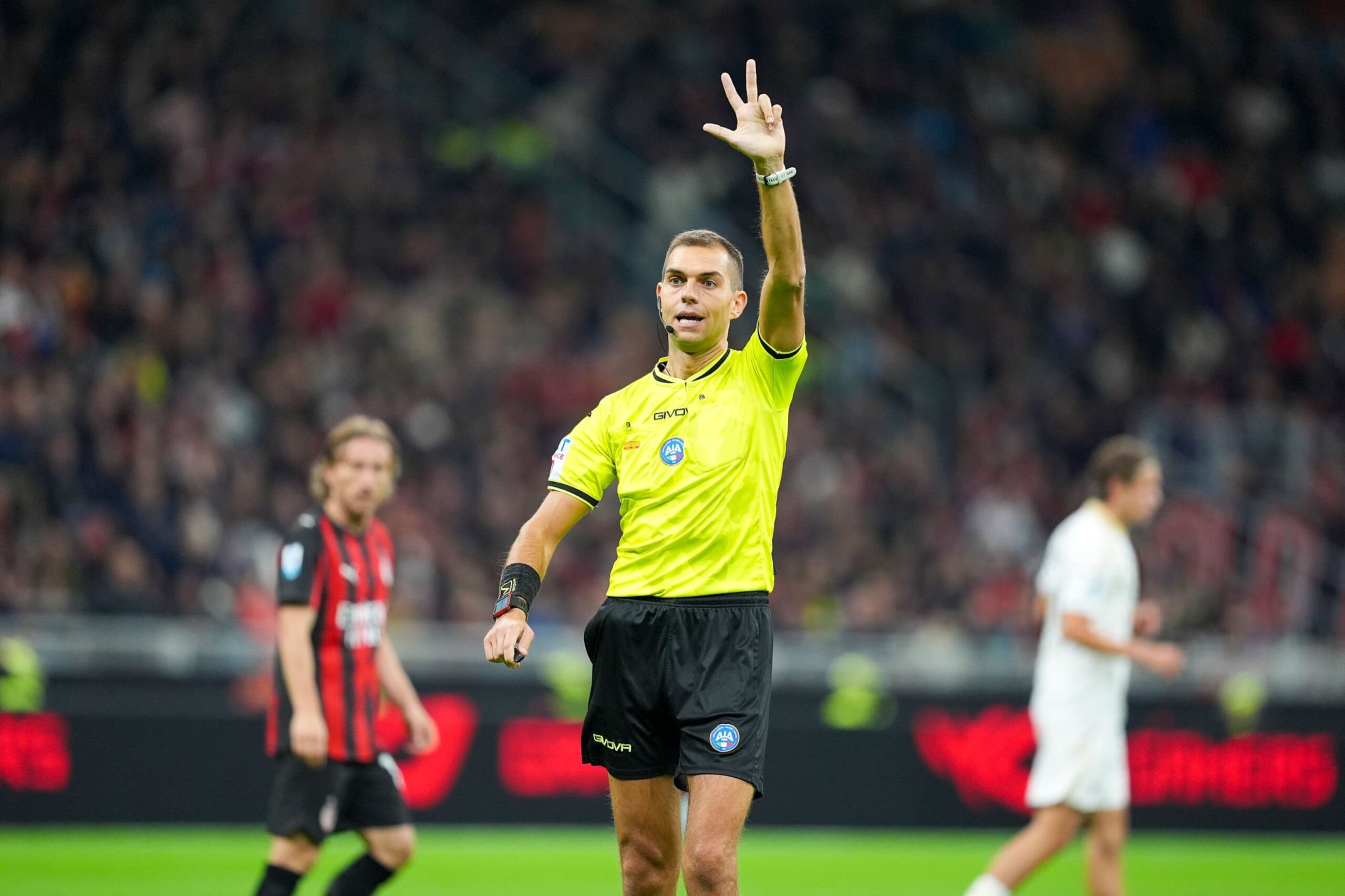 Luca Zufferli referees the match between AC Milan and Pisa SC 1909 in Serie A at Giuseppe Meazza Stadium in Milan, Italy, on October 24, 2025. (Photo by Alessio Morgese/NurPhoto via Getty Images)