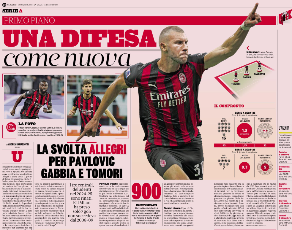 His team is following this plan: the players have absorbed the new tactical instructions and apply them on the field to avoid the mistakes that cost eighth place in 2024-25. Twelve months ago, after ten rounds, the Rossoneri had conceded thirteen goals and kept a clean sheet only twice.