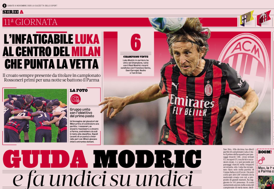 Work and quality. Luka was supposed to be managed, but he is the one managing the team. At forty, he makes teammates fifteen or twenty years younger move at his rhythm. Only one player has spent more minutes on the pitch in Serie A: Gabbia, aged twenty-six, with 900 minutes. Luka has played 875, just twenty-five fewer. Of the total available time, he missed 16 minutes in the opener against Cremonese and another nine in Udine, where his substitution was met with a standing ovation. Modric has played more than Saelemaekers, third in appearances, and more than anyone else. Fatigue does not cloud his thoughts. His latest match, against Roma at San Siro, proves it. In his tenth league match out of ten, Luka led the team in completed passes (38), crosses attempted (7), recoveries (7), touches (6), and chances created (2). He was also second for completed passes in the final third, with eight, writes La Gazzetta dello Sport.