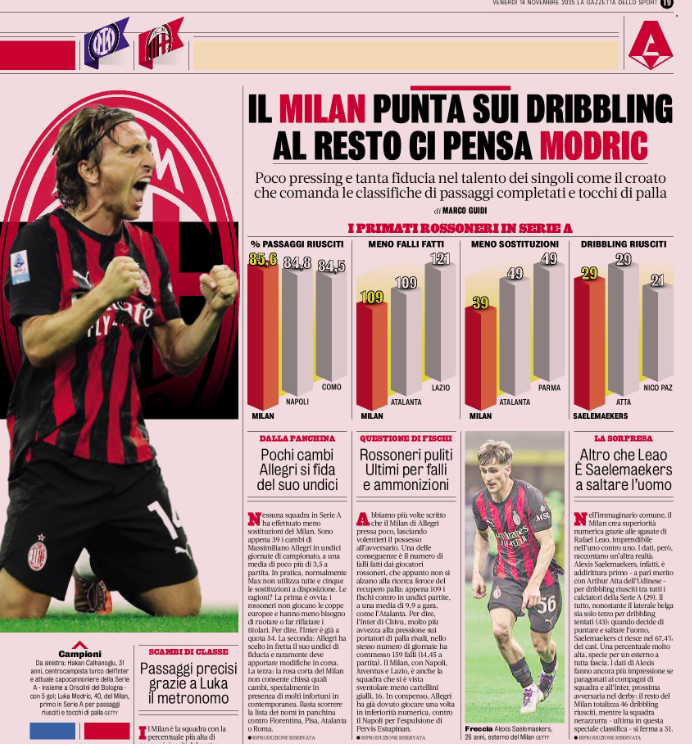We have written many times that Allegri’s Milan press little and leave possession to the opponent. One effect is the low number of fouls, since the players do not push high to win the ball back. Only 109 fouls in eleven matches, an average of 9.9 per match, the same as Atalanta. Inter under Chivu, who press ball carriers much more, have committed 159 fouls in the same number of matches, 14.45 per match. Milan, together with Napoli, Juventus and Lazio, have also seen the fewest yellow cards, 16. Allegri has already played once with ten men, against Napoli after Pervis Estupinan was sent off, as relayed via those at La Gazzetta dello Sport.