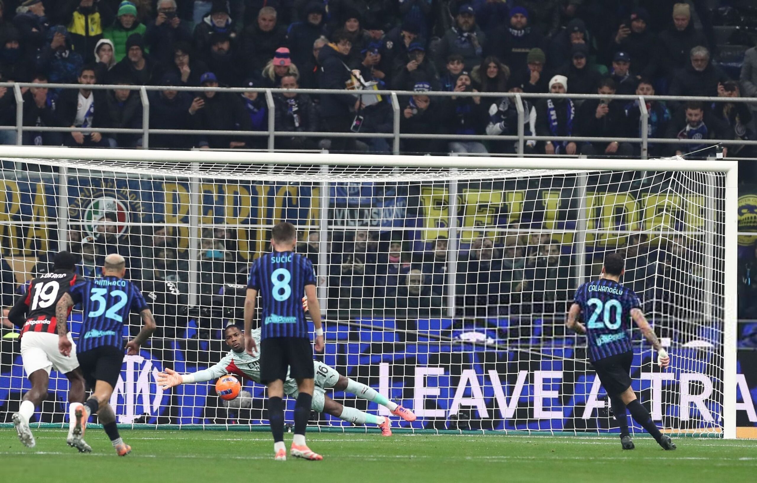 Mike Maignan of AC Milan saves a penalty kick Hakan Calhanoglu of FC Internazionale during the Serie A match between FC Internazionale and AC Milan at Giuseppe Meazza Stadium on November 23, 2025 in Milan, Italy. (Photo by Marco Luzzani/Getty Images)
