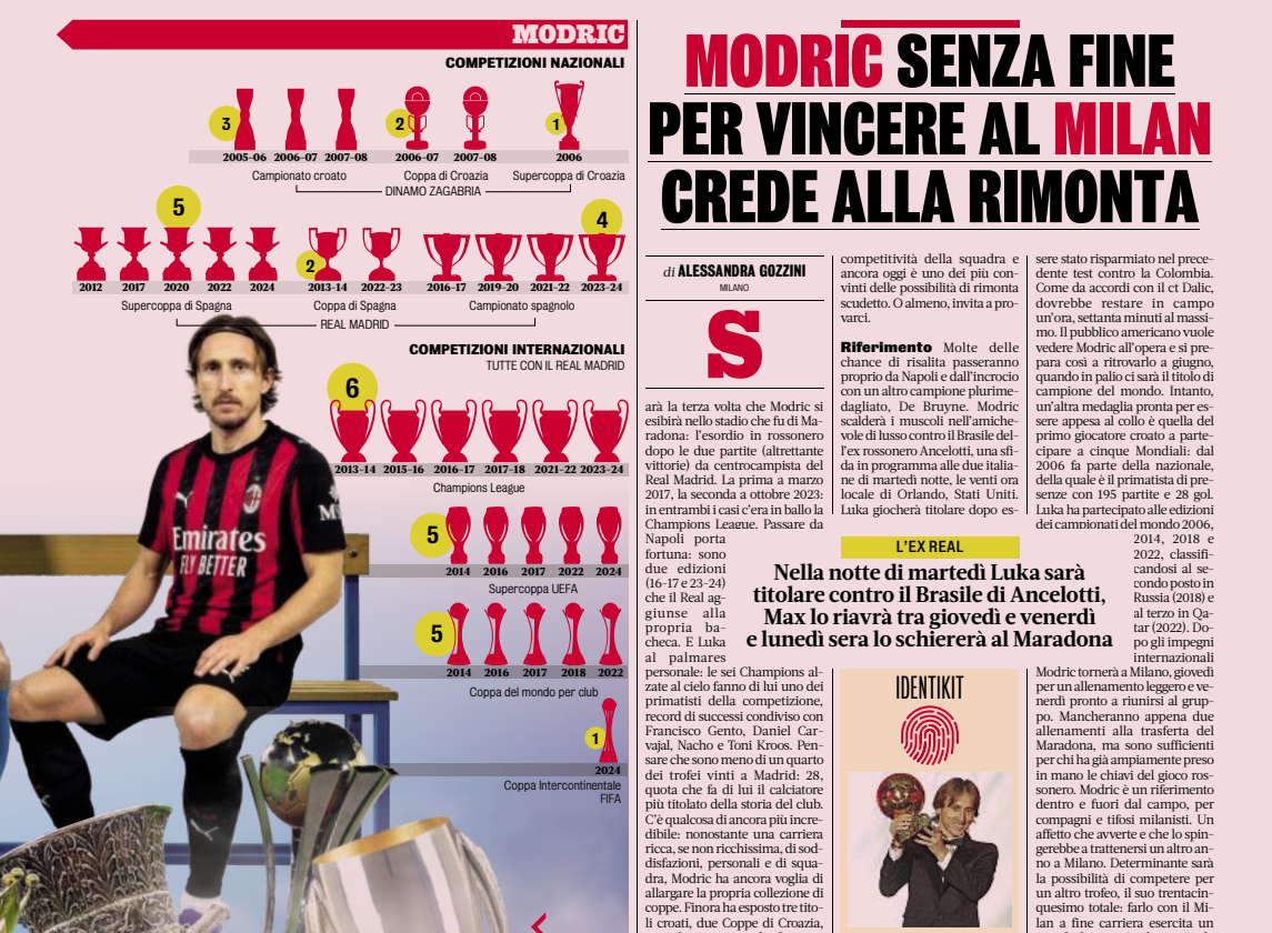 It is an affection he feels, and one that could persuade him to stay another year in Milan. A decisive factor will be the chance to compete for another trophy, his thirty-fifth overall. Achieving that with Milan at the end of his career holds great appeal. Even wearing the red-and-black shirt in the Champions League is a temptation, not to mention a potential new record to take from Zlatan Ibrahimović: Zlatan is the oldest Milan player to have appeared in Serie A, at 41 years and 146 days. Luka would turn 41 in September.